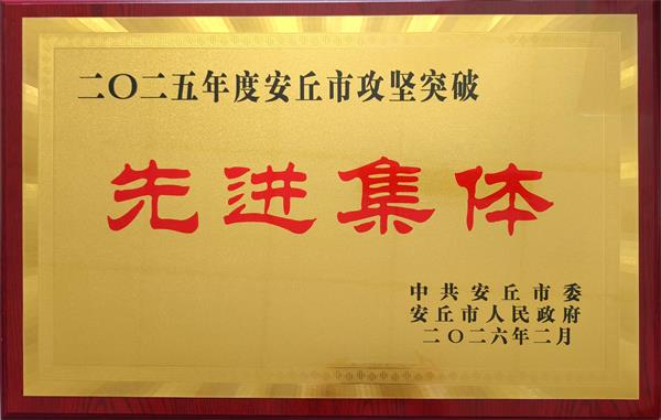 会上宣读了 2025 年度先进集体、先进个人通报并举行颁奖仪式。集团公司荣获 “安丘市攻坚突破先进集体” 称号,公司董事长刘海清同志上台领奖并作表态发言。